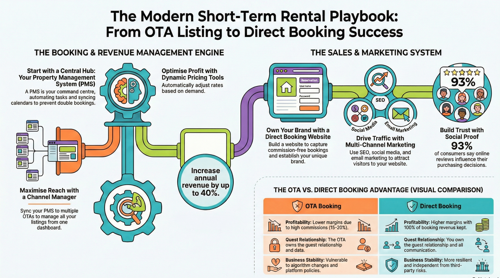 The comprehensive playbook for an independent host covers choosing the right Property Management System (PMS), building a high-converting property website, growing social proof, and creating your own content engine through SEO, social media, and email marketing.